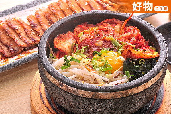 吱吱作響的熱燙石鍋裡面盛滿香Q米飯、泡菜、雞蛋及青菜等豐富配料,用湯匙往下一舀,吱~~~略帶焦香,口感十足的鍋巴立即誕生!充份攪拌所有食材,不管是脆、辣、鮮、香……各種滋味一次品嚐!